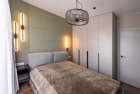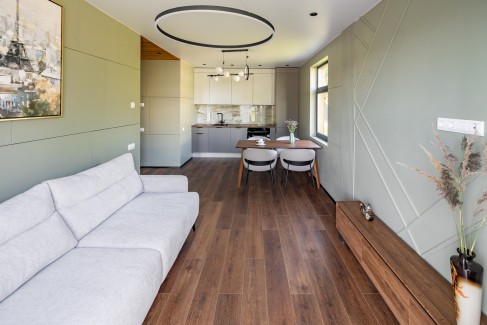- Мебель: кровать двуспальная, тумбы прикроватные, стол 1500х750 мм, стулья 4 шт., навесной шкаф 3 шт., кухонная мебель, диван раскладной.