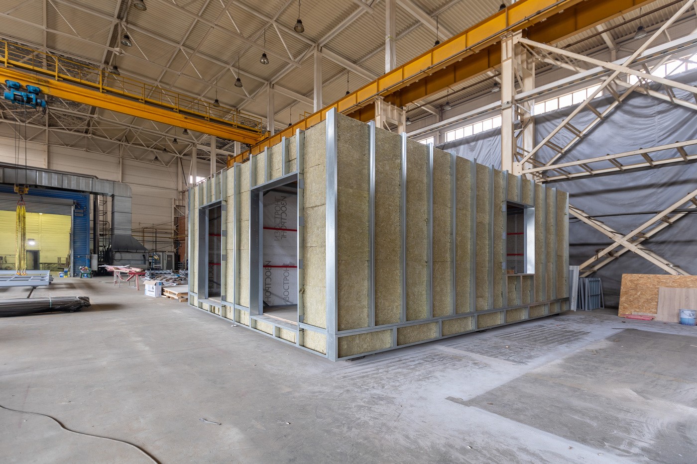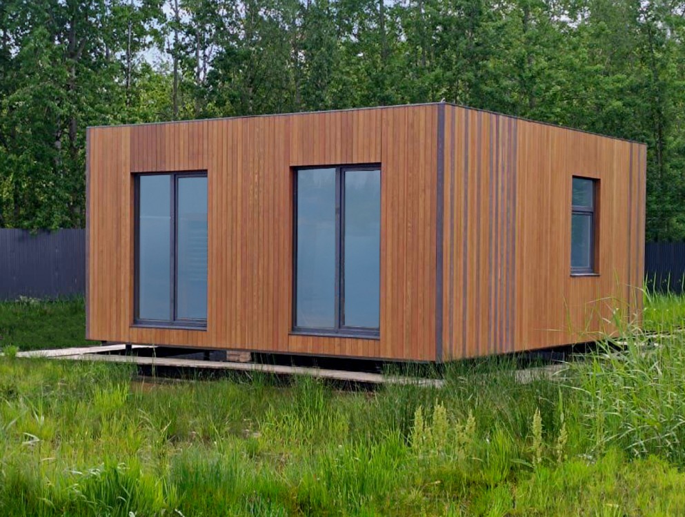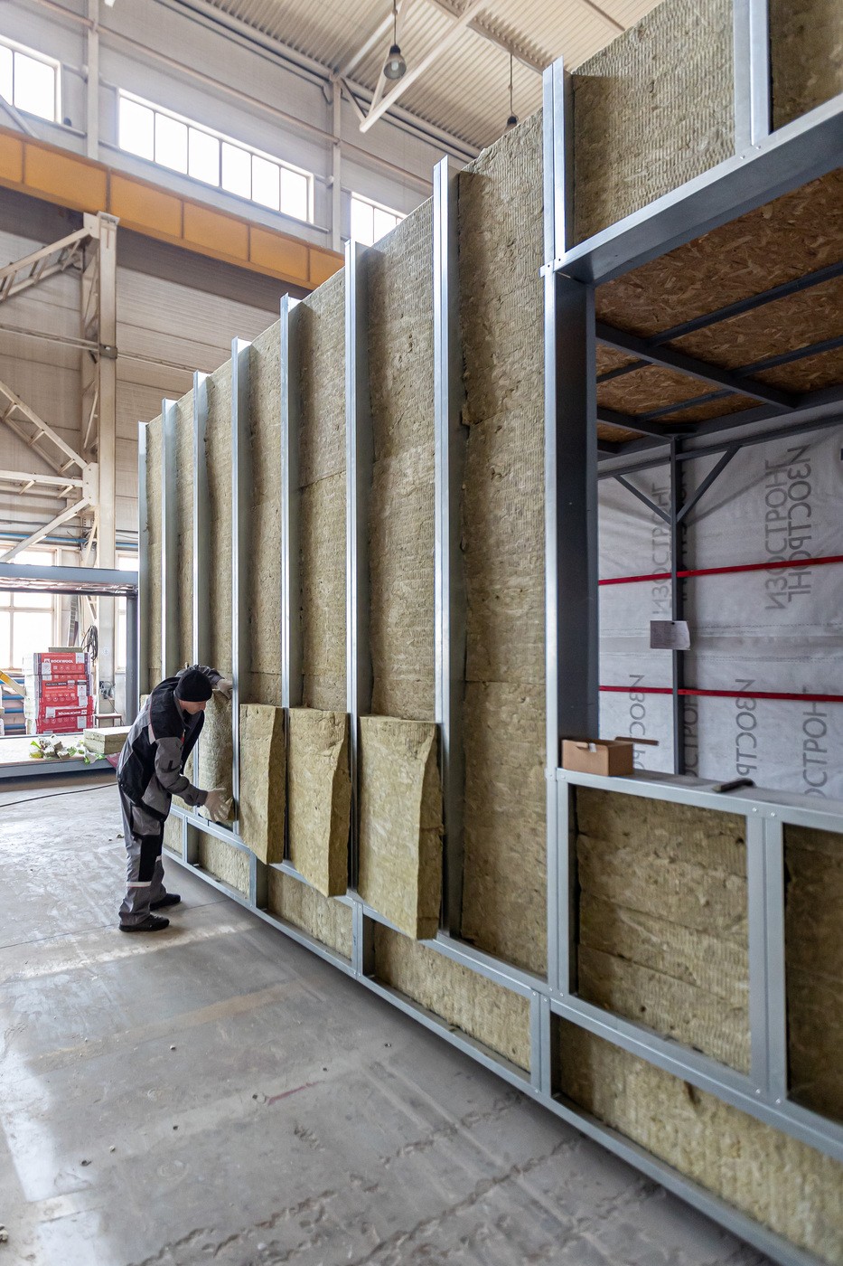 Конструкция стен: внутренняя отделка фанера масло, металлокаркас, сэндвич-панель 150 мм, навесной фасад - вертикальный планкен.