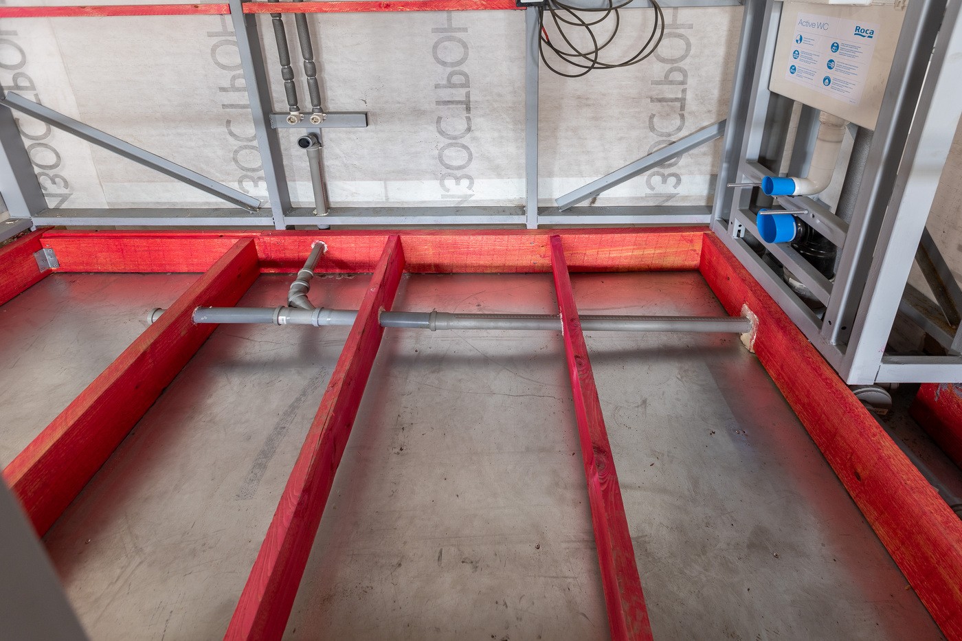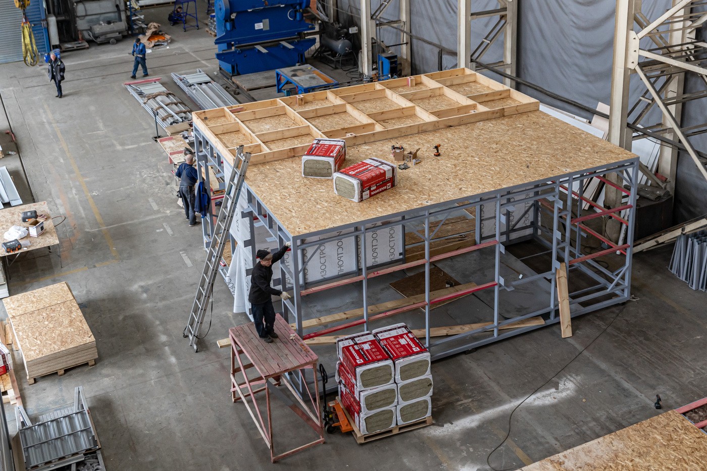 Конструкция пола: оцинкованный лист 1мм., утепление 200 мм в обрешетке из антисептированной 40х150, внутренний каркас основания - труба 80х40х3, пароизоляция SW – ветро-влагозащитная, пароизоляция изостронг (тип А), чистовое покрытие.