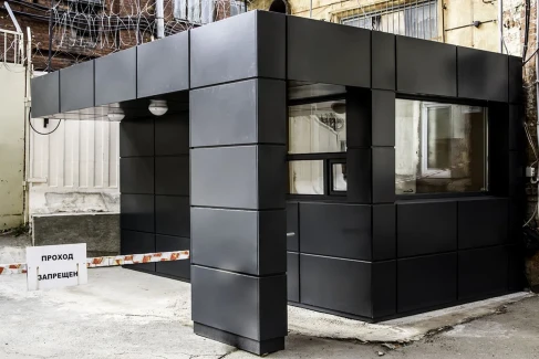 Мобильный пост охраны снаружи обшит металлокассетами, оборудован системами для контроля доступа сотрудников.