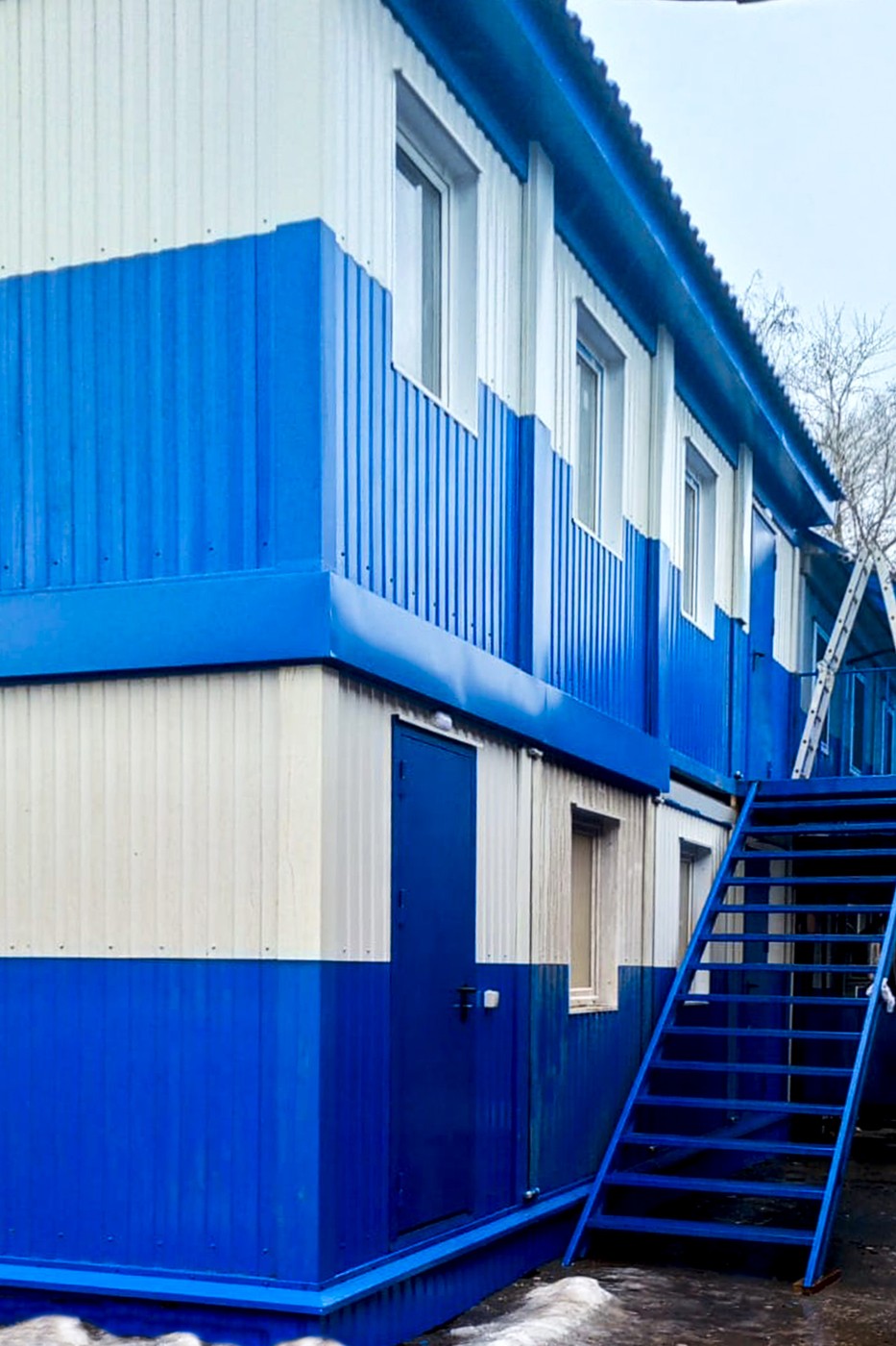 Завершили монтаж двухэтажного модульного здания на базе восьми блок-контейнеров с габаритами 6,1 × 2,4 × 2,6 м. Объект имеет административно-бытовое назначение.