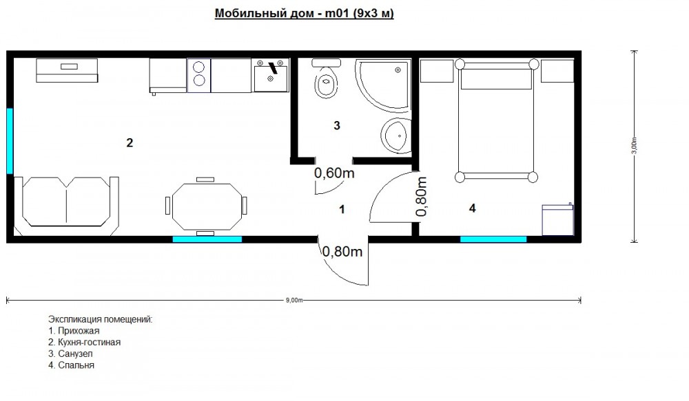 Мобильный дом габаритами 9 × 3 м выполнен на базе блок-контейнера и спроектирован как компактное жильё с привычной квартирной логикой. Внутреннее пространство включает входную зону, кухню-гостиную, отдельный санузел и изолированную спальню, что позволяет комфортно проживать в доме круглый год или использовать его как дачный и гостевой модуль.