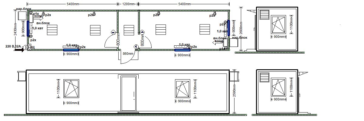 Офисный модуль – это одноэтажное здание площадью 29,16 м² (12 × 2,43 × 2,6 м), выполненное на базе прочного стального блок-контейнера. Конструкция разработана по планировке «распашонка» и включает два отдельных помещения, что позволяет эффективно организовать рабочие зоны для тальмана. Изделие поставляется в полной заводской готовности – с внутренней отделкой, инженерными системами и элементами входной группы.