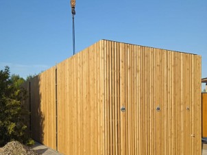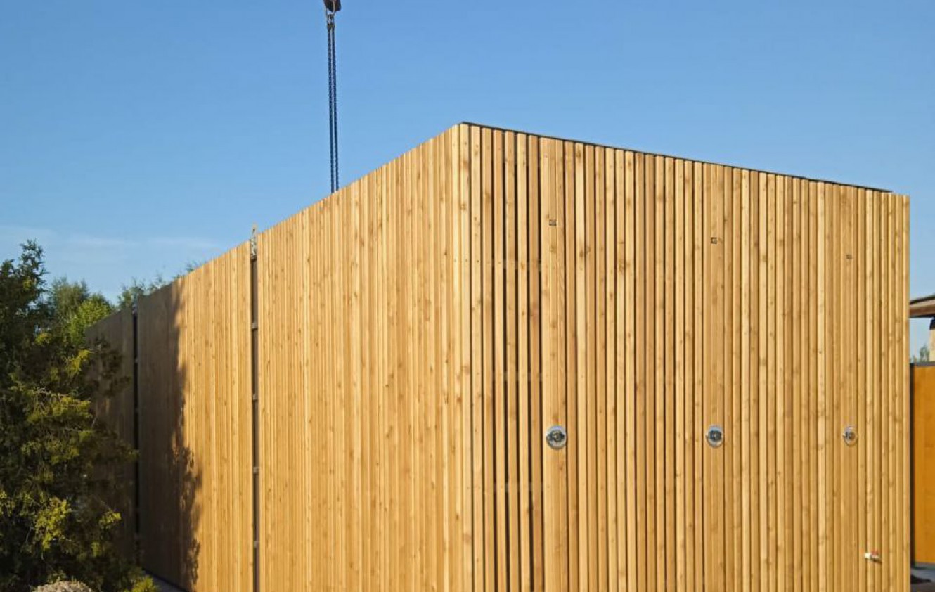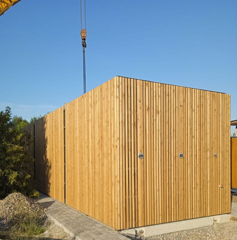 Конструкция блока основана на прочном сварном стальном каркасе: верхняя рама изготовлена из гнутого профиля 180×70×3 мм, нижняя – из швеллера 120×50×3 мм, лаги пола – из швеллера 100×50×3 мм, а угловые стойки – из гнутого профиля 175×150×3 мм. Наружные поверхности окрашены в цвет RAL 7024, обеспечивающий защиту от атмосферных воздействий. Фасад дополнительно облицован рейками из лиственницы с декоративным покрытием под дуб, что улучшает внешний вид здания и одновременно защищает конструкции от воздействия среды.