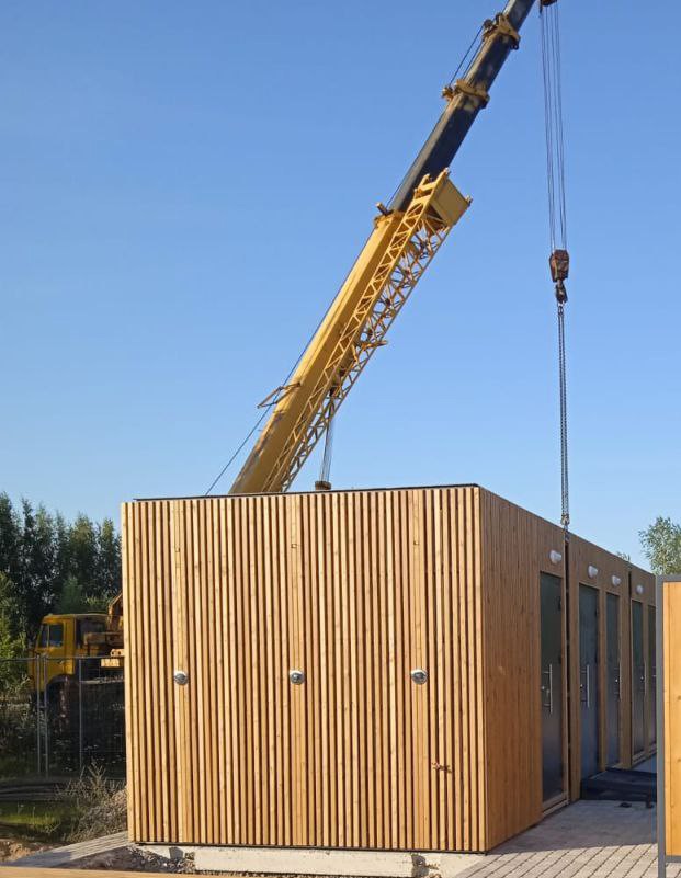 Изготовлен и установлен санитарно-бытовой модуль размерами 3,0 × 10,0 х 2,78 м с дополнительным проливным полом длиной 1,2 м, предназначенным для душевой зоны и рассчитанным на демонтаж в зимний период. Здание выполнено на базе блок-контейнера типа «Сэндвич» и поставлено в полной заводской готовности – с инженерными системами, оборудованием и комплектом эксплуатационной документации.