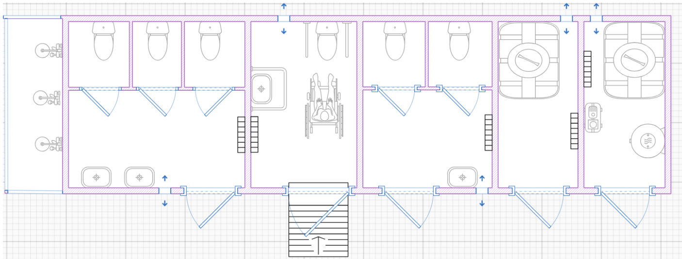 Внутреннее пространство включает санитарные помещения с унитазами и раковинами, помещение для маломобильных групп населения с расширенными дверными проёмами и установленными поручнями, а также необходимые технические зоны. К модулю примыкает летняя душевая зона. Входная группа оборудована пандусом и защитным бортиком высотой 30 мм, что обеспечивает удобный и безопасный доступ.